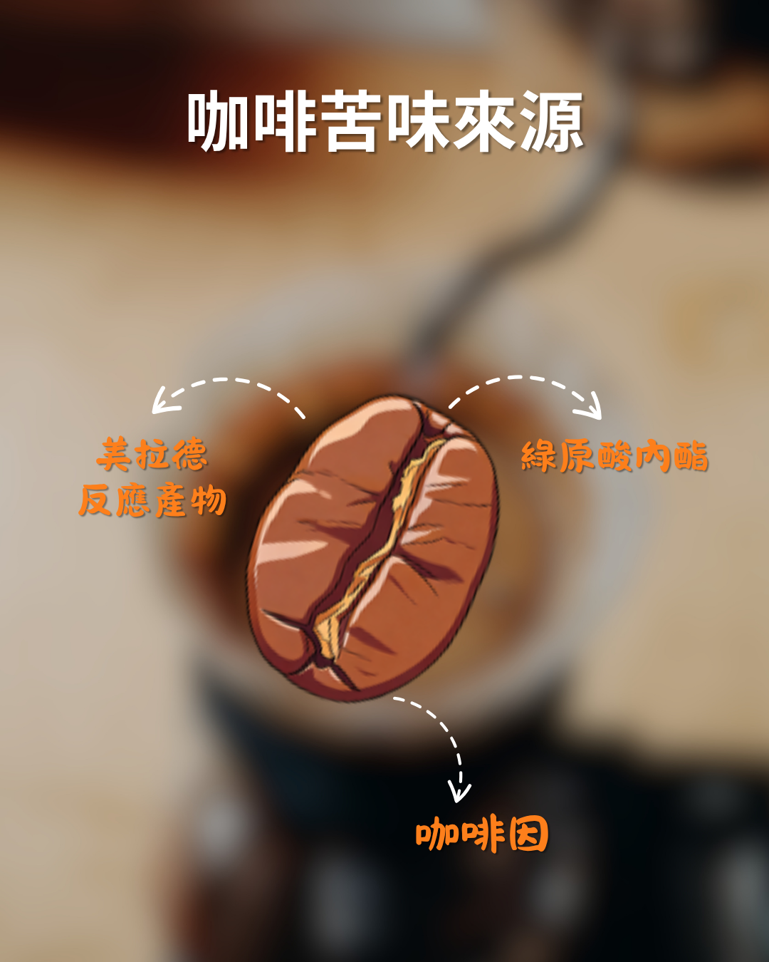 咖啡嘅苦,唔單只來自咖啡因,仲有烘焙時產生嘅其他物質,例如綠原酸內酯、美拉德反應產物(類黑精)等等。烘焙越深,呢啲物質就越多,咖啡就越苦,但同咖啡因完全無關。