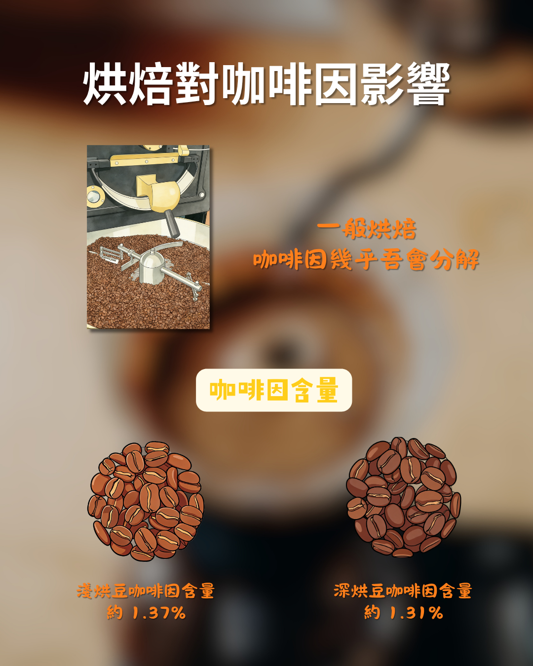 咖啡因係一種相對穩定噶生物鹼,一般烘焙溫度下(通常唔超過 200℃),咖啡因幾乎吾會分解或揮發。不過深度烘焙會讓咖啡豆失水、結構變鬆散,雖然萃取時咖啡因溶出率可能稍微提高,但同等重量下,深烘豆咖啡因含量反而可能略低於淺烘豆(例如淺烘豆咖啡因含量約 1.37%,深烘豆約 1.31%)。