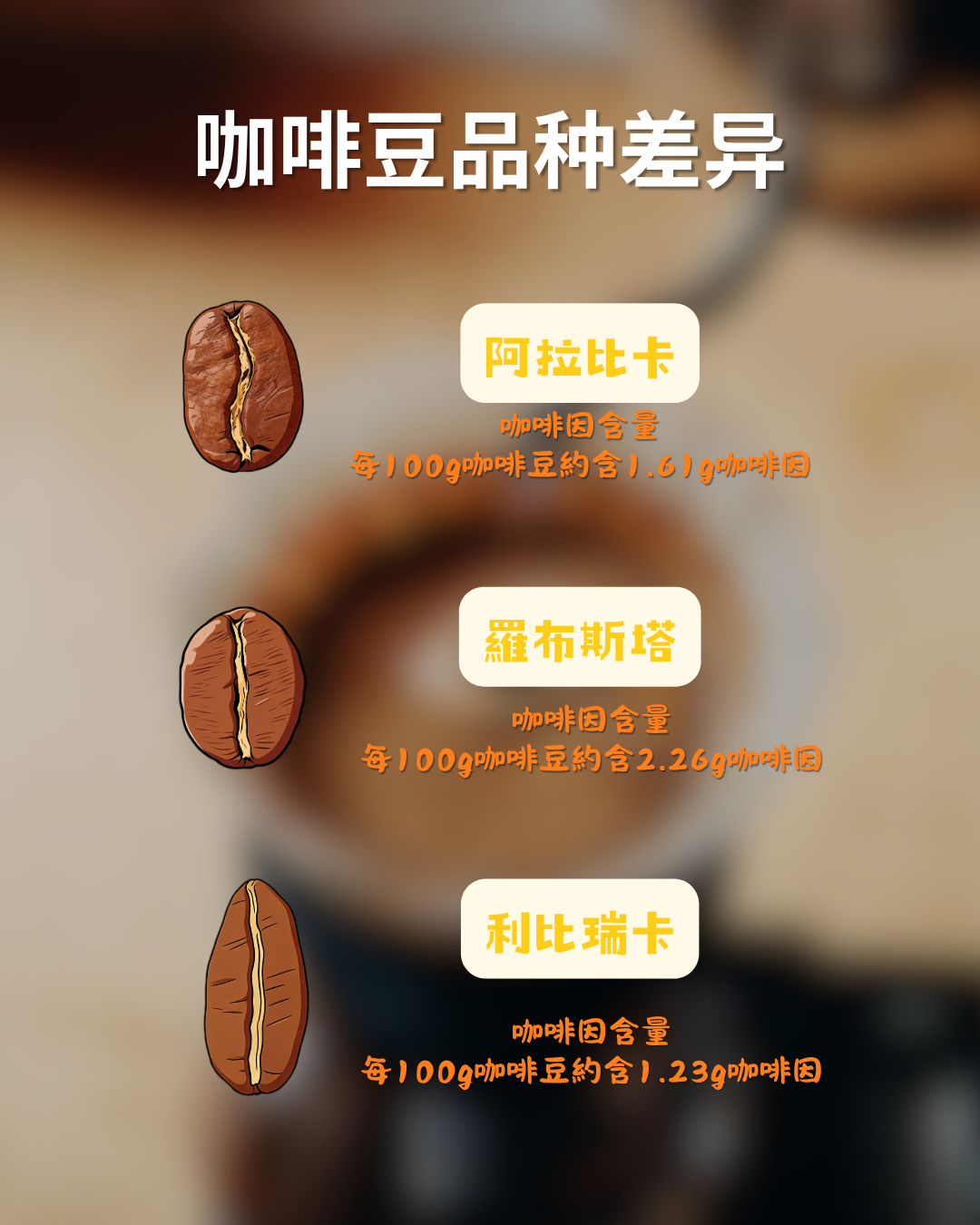 唔同品種噶咖啡豆,咖啡因含量差異很大。例如:羅布斯塔豆噶咖啡因含量大約係阿拉比卡豆噶 2 倍,但羅布斯塔豆本身風味偏苦澀,因此唔可以單靠苦味來判斷咖啡因含量