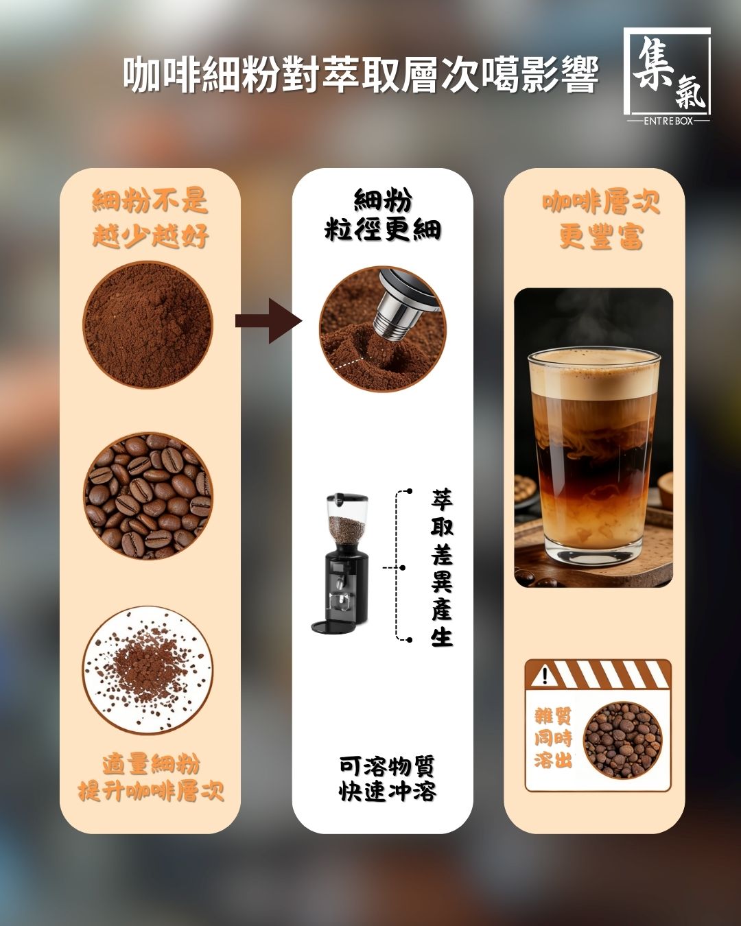細粉唔係越少越好,因為適量嘅細粉可以提升咖啡層次。由於細粉粒徑更細,入面嘅可溶物質會更快被沖溶出來,令萃取過程產生少少差異,沖出來嘅咖啡會有更豐富嘅層次感。不過,溶解得快,會連埋啲唔太好嘅雜質都一齊溶出嚟。