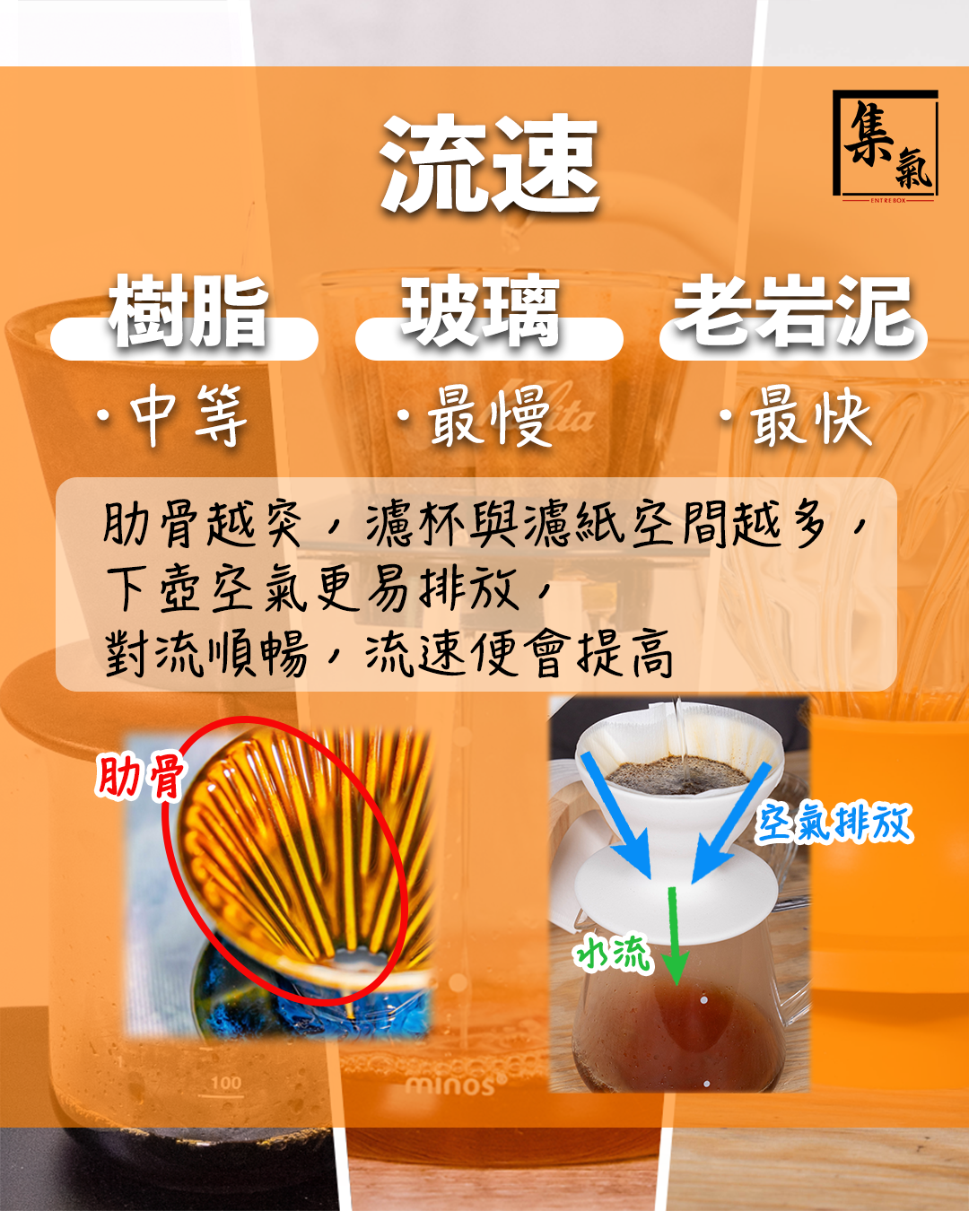 肋骨越突,濾杯與濾紙嘅空間就會越多,使下壺空氣更容易排放,對流順暢以致流速提高。