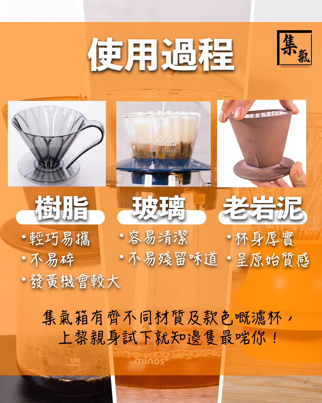 我地集氣箱有齊樹脂、玻璃、老岩泥唔同款色嘅濾杯,上黎親身試下就知邊隻最啱你