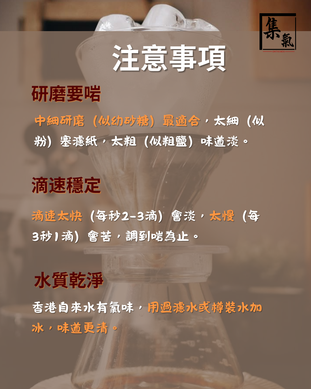 - 研磨要啱:中細研磨(似幼砂糖)最適合,太細(似粉)塞濾紙,太粗(似粗鹽)味道淡。