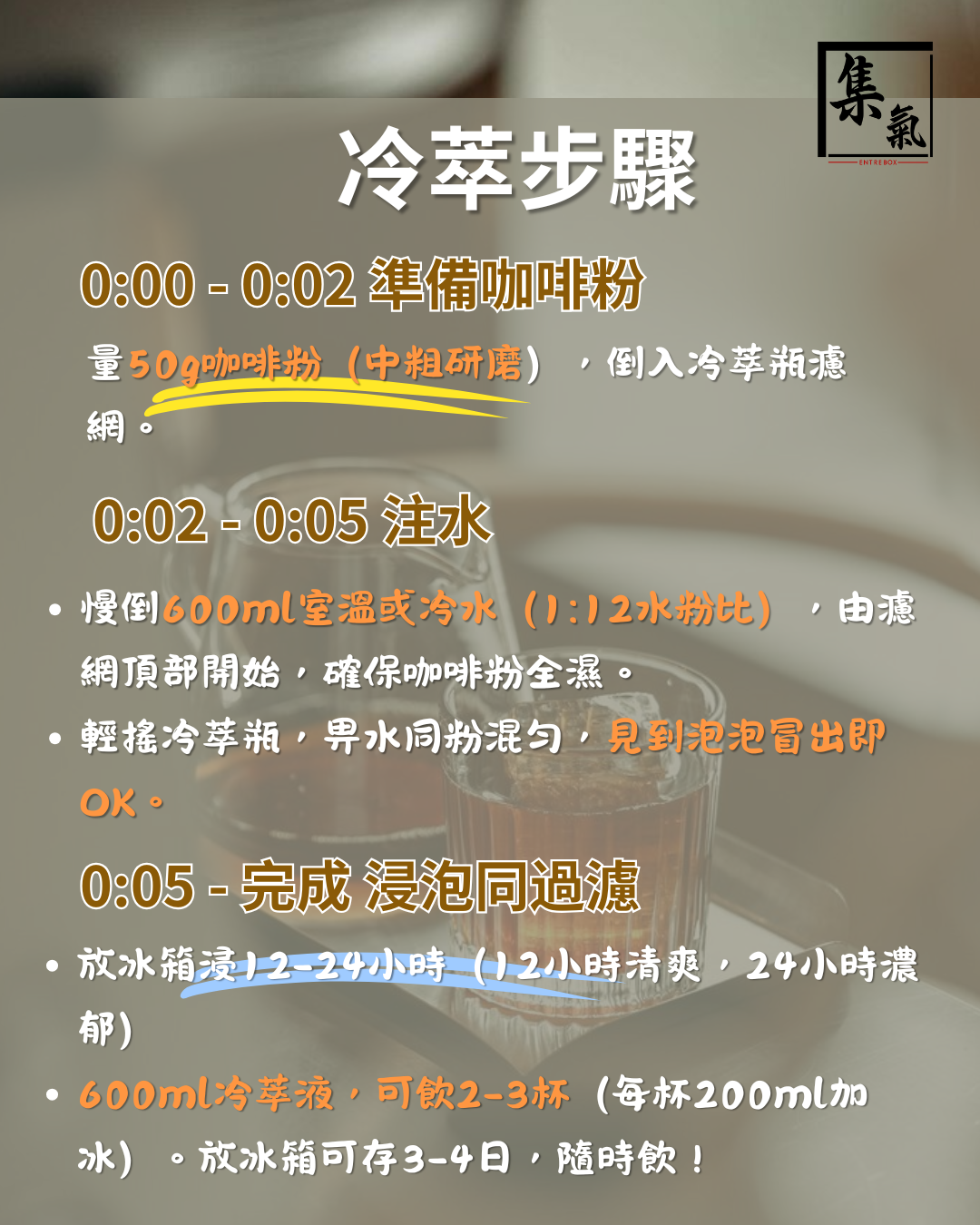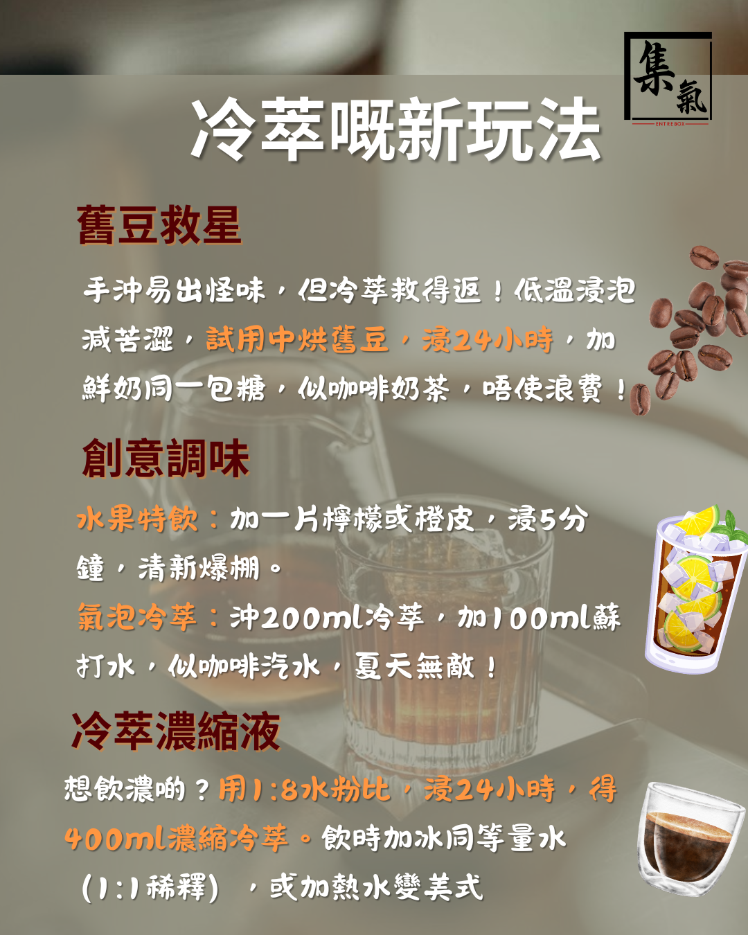 - 氣泡冷萃:沖200ml冷萃,加100ml蘇打水,似咖啡汽水,夏天無敵!