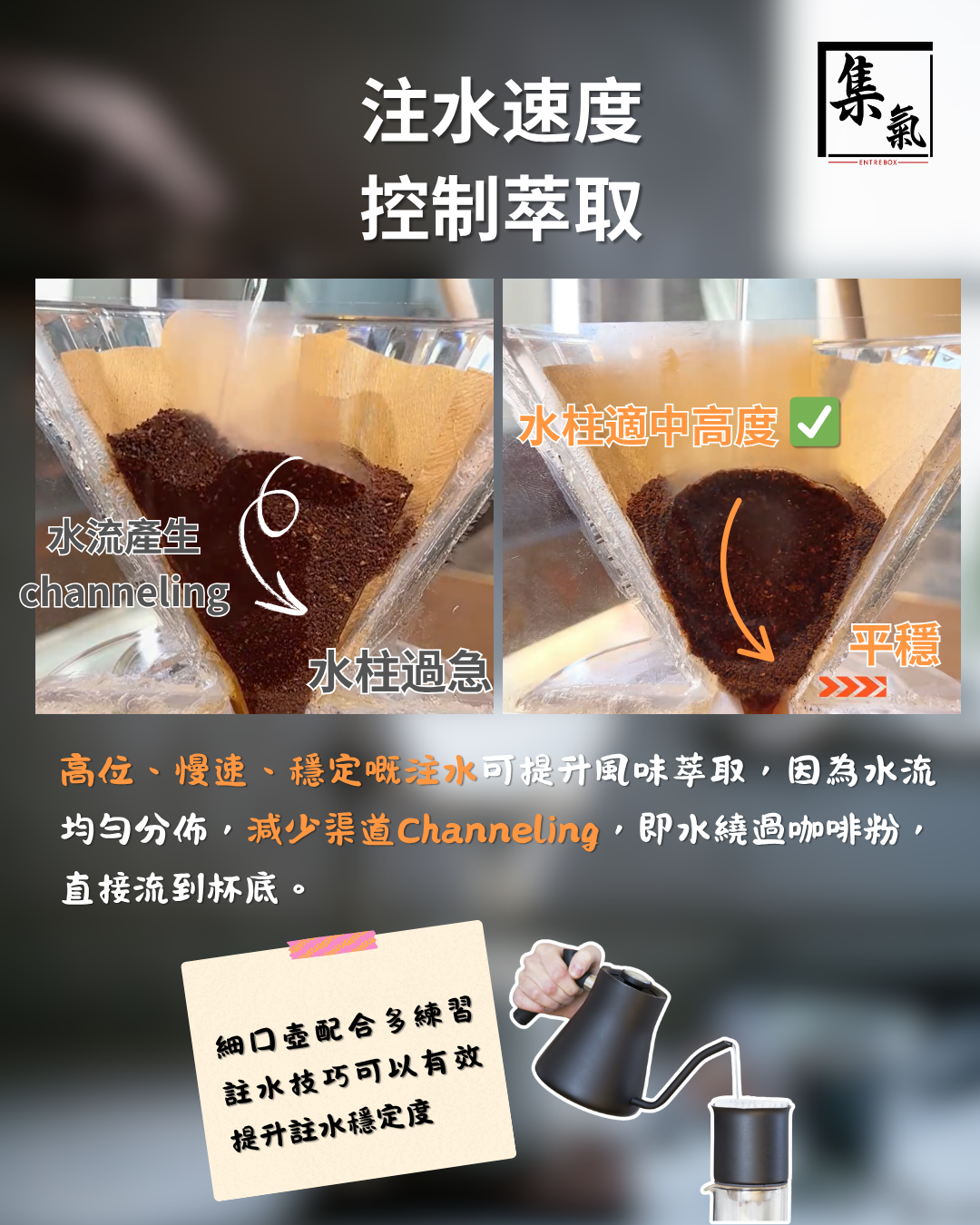 水柱速度同注水方式影響水同咖啡粉嘅接觸時間,係控制萃取嘅關鍵。可提升風味萃取,因為水流均勻分佈,減少「渠道」(Channeling),即水繞過咖啡粉,直接流到杯底。