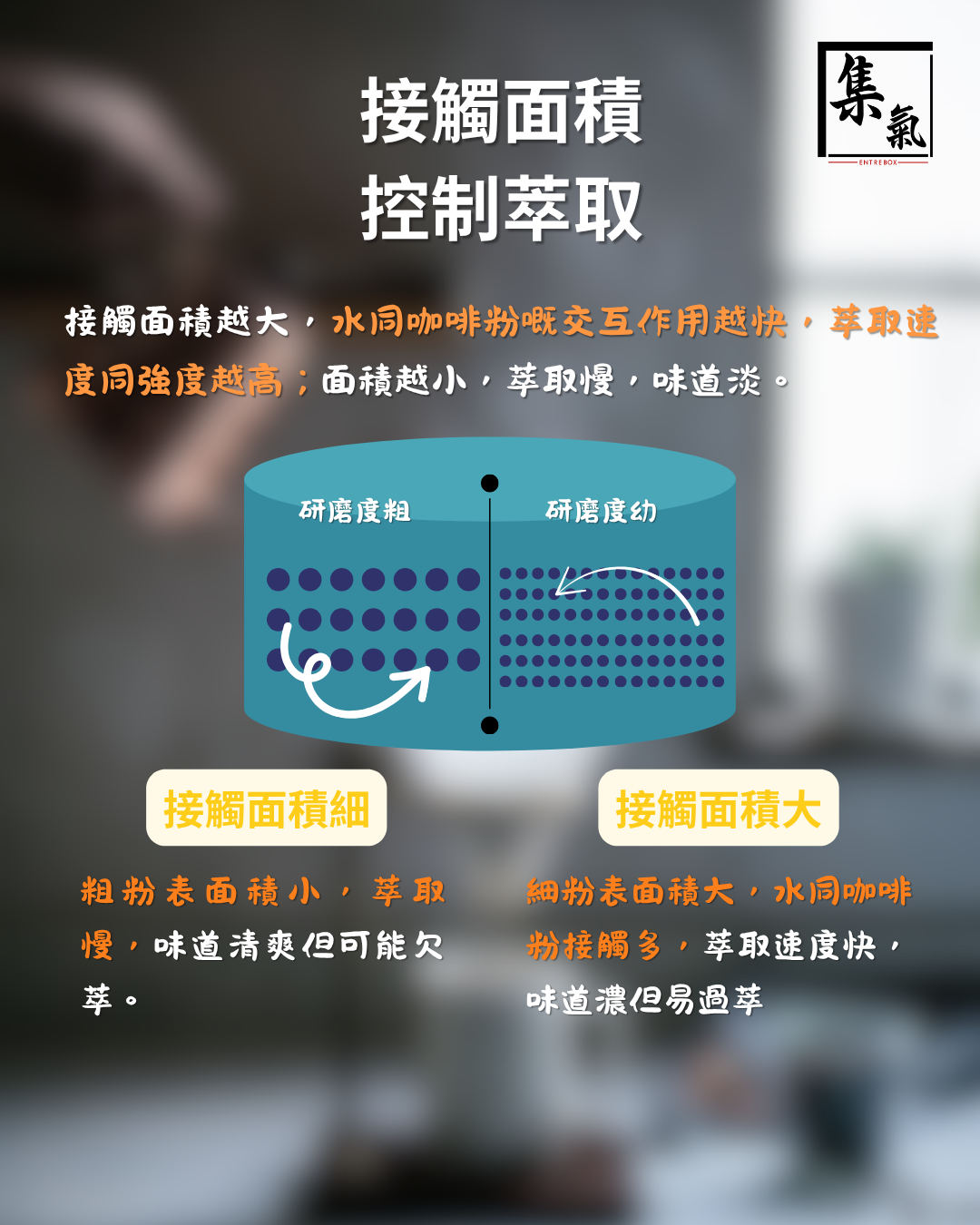 接觸面積越大,水同咖啡粉嘅交互作用越快,萃取速度同強度越高;面積越小,萃取慢,味道淡。