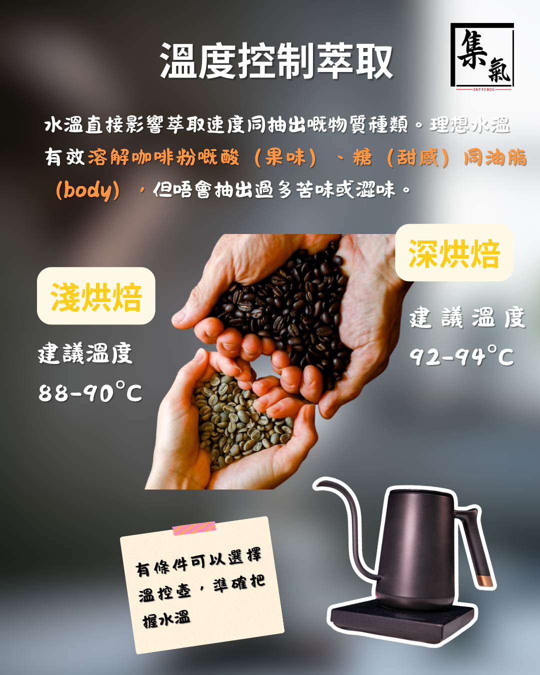 為何重要:水溫太低(低於85°C)萃取慢,味道淡,似飲無味水;太高(超過96°C)會抽出唔想要嘅苦味同澀味,尤其對淺烘豆(如Entrebox衣索比亞,帶花果香)影響大。深烘豆(如Illy中深烘)可耐高溫,但都要小心過萃。