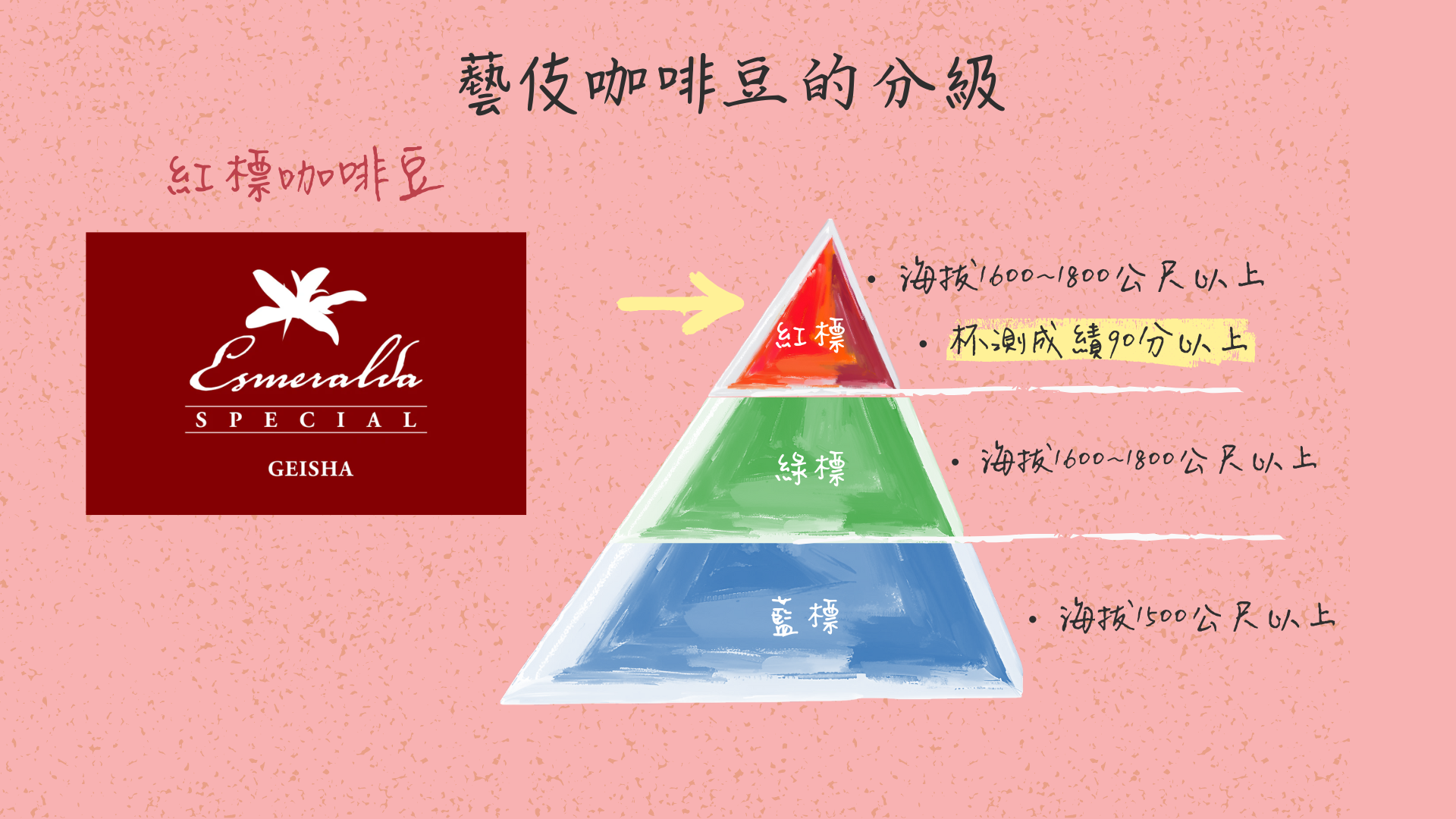 「紅標」Red Label是對 Geisha 咖啡的最頂級分級系統。紅標批次主要來自海拔 1,600–1,950 米以上(部分達 +1,950m)的精選微批次(如 Jaramillo、Cañas Verdes、Fundador 等高山區塊),杯測分數需達 90 分以上(常 91+)。這些批次來自莊園最優質地塊,產量極稀,部分直接參與年度 Esmeralda Special 拍賣會,以高價落槌,代表全球 Geisha 的巔峰品質。相較綠標(Private Collection,87–90 分左右)與藍標(Geisha 1500,海拔較低),紅標象徵嚴格篩選下的「皇冠級」風土精華,是精品咖啡愛好者追逐的終極傳奇。