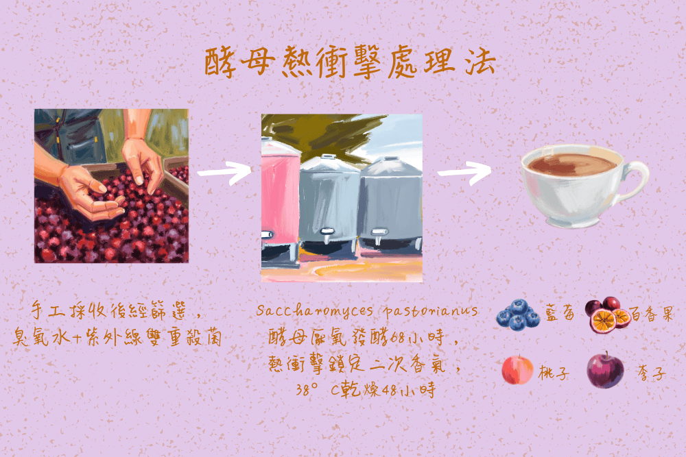 這批 Yeast Thermal Shock 採用極致精密的創新流程,從手工採收開始,經大小與密度雙重篩選,再以臭氧水與紫外線雙重殺菌,確保零汙染。新鮮櫻桃進入厭氧生物反應器,以 18°C 發酵 52 小時,期間添加 Saccharomyces pastorianus 酵母,喚醒深層香氣。去果肉後回收黏液,加入第二階段 21°C 厭氧黏液發酵 48 小時,總發酵達 68 小時。隨後進行熱衝擊洗滌:先以 40°C 熱水開啟豆孔吸收二次香氣,再以 12°C 冷水瞬間鎖定風味。最後在 38°C 控制乾燥 48 小時,讓藍莓、百香果、桃子與李子的層次完美固定,呈現乾淨、濃郁且前所未有的果香深度。