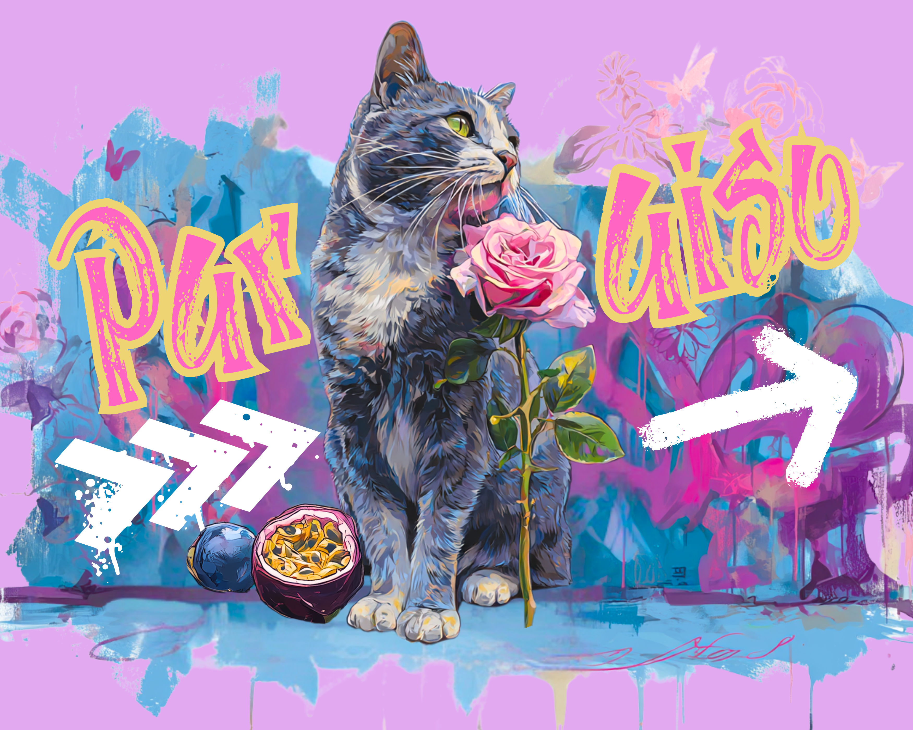 包裝以粉紫為基調,充滿街頭塗鴉與流行藝術能量,中央一隻灰藍貓站在粉玫瑰旁,綠眸閃爍,旁邊爆裂的百香果與藍莓如同酵母發酵的風味。貓咪神秘、優雅卻帶點叛逆,呼應這款豆子乾淨卻極致瘋狂的果香衝擊;塗鴉風格文字融入潑墨與滴漆,就像熱衝擊的極端溫差蛻變——從熱到冷的瞬間鎖住漿果精華。整體設計大膽、玩味十足,融合熱帶浪漫與現代街頭文化,邀請年輕玩家一同探索 Wilton 的發酵魔法,讓每一次沖泡都像打開一場粉紫色的果汁派對。