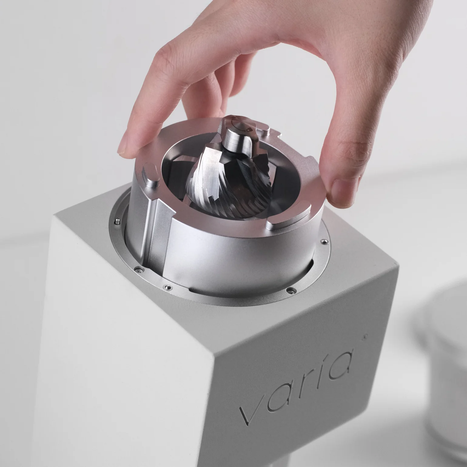 Varia VS4 手沖意式兩用磨豆機,53mm六芯錐形刀盤搭配變速200W無刷馬達,單劑量低殘粉設計,精準控制從意式到手沖風味,適合追求一致萃取的家用咖啡愛好者。