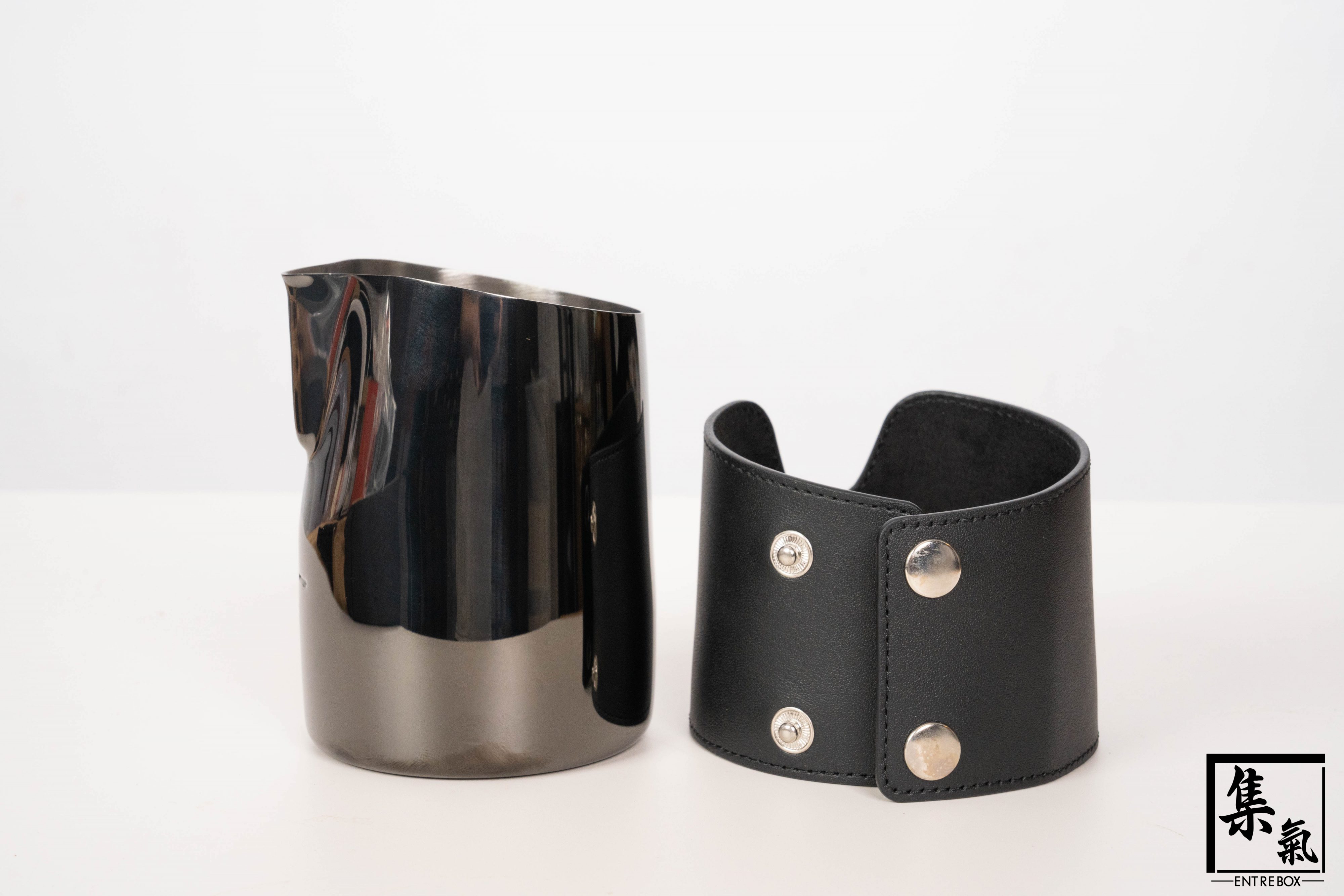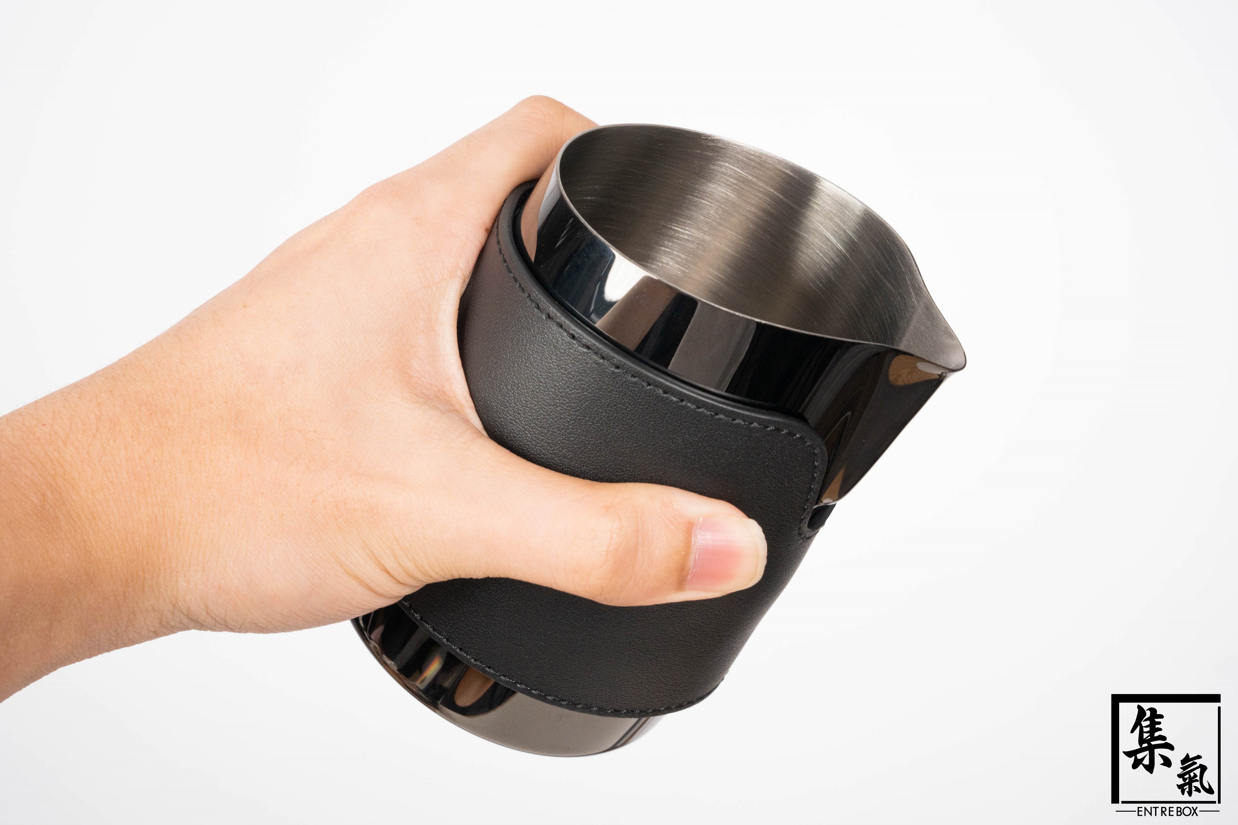 WPM 無柄拉花鋼杯設計方便用家直接手握杯身,控流更得心應手。亮面黑杯身配合純黑皮革,時尚型格;皮革亦可拆卸,方便清潔。