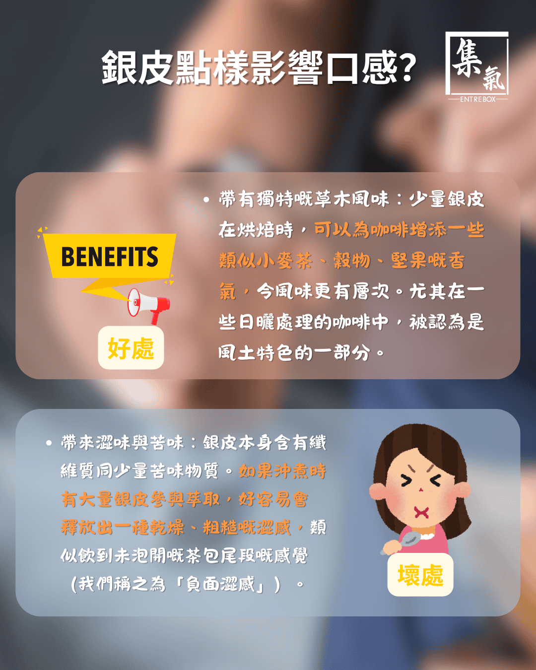 - 帶有獨特嘅草木風味:少量銀皮在烘焙時,可以為咖啡增添一些類似小麥茶、穀物、堅果嘅香氣,令風味更有層次。尤其在一些日曬處理的咖啡中,被認為是風土特色的一部分。