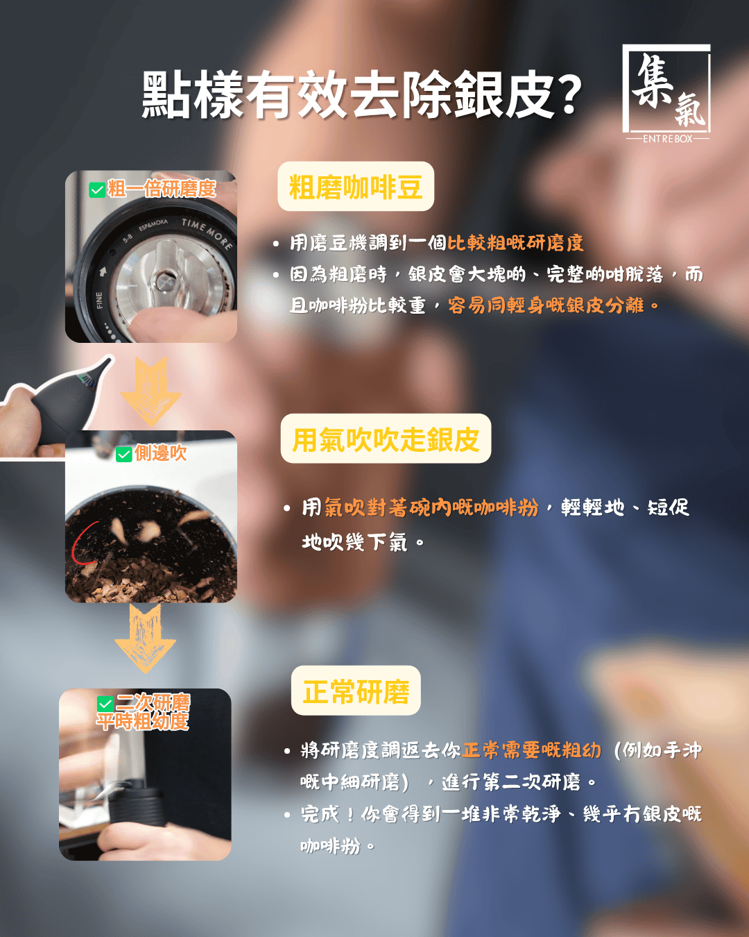 - 點解要粗磨? 因為粗磨時,銀皮會大塊啲、完整啲咁脫落,而且咖啡粉比較重,容易同輕身嘅銀皮分離。如果一嚟就幼磨,銀皮會被磨到碎晒,同咖啡粉難分難解。