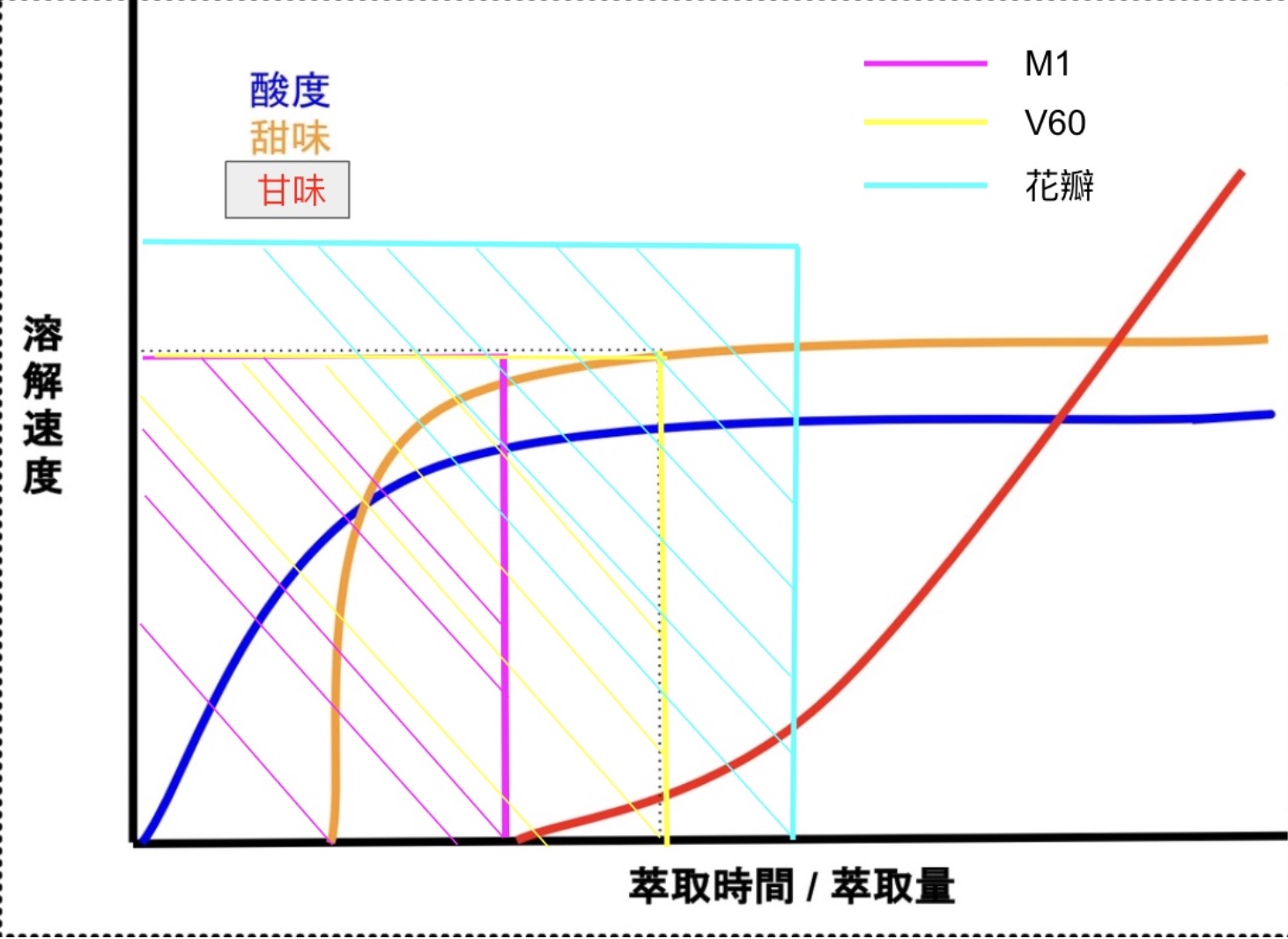 隨住延長萃取時間,散發酸味和甜味的可溶解物質數量和溶解速度會慢慢上升,可是,達到未段時間,會停止上升趨勢;同時,散發甘味的可溶解物質在中段時間才開始被萃取,它的溶解速度慢慢上升。