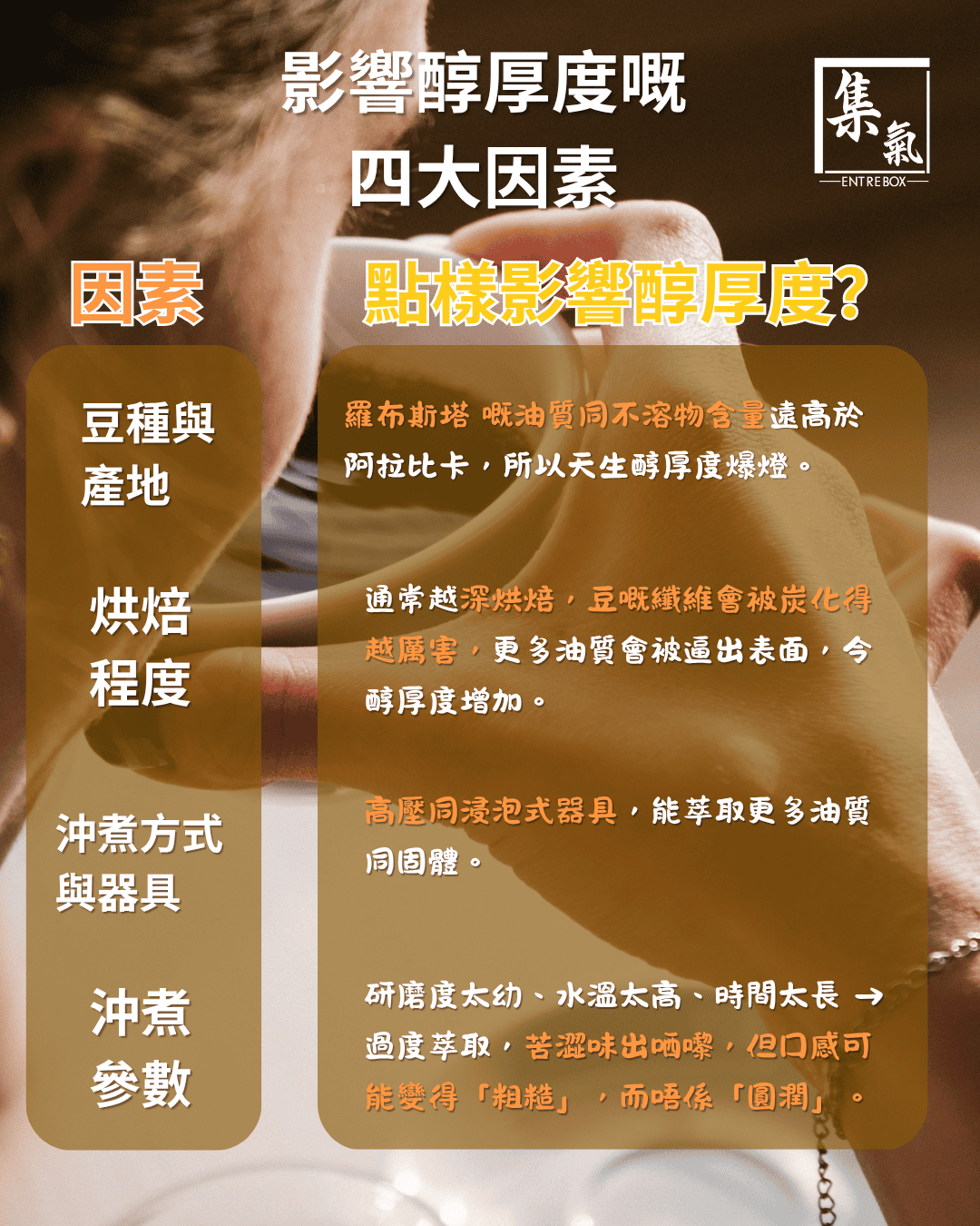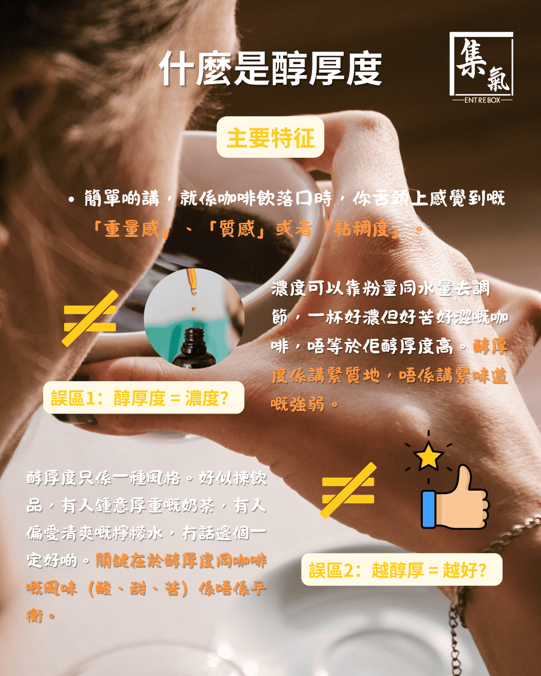 醇厚度(Body),簡單啲講,就係咖啡飲落口時,你舌頭上感覺到嘅「重量感」、「質感」或者「黏稠度」。