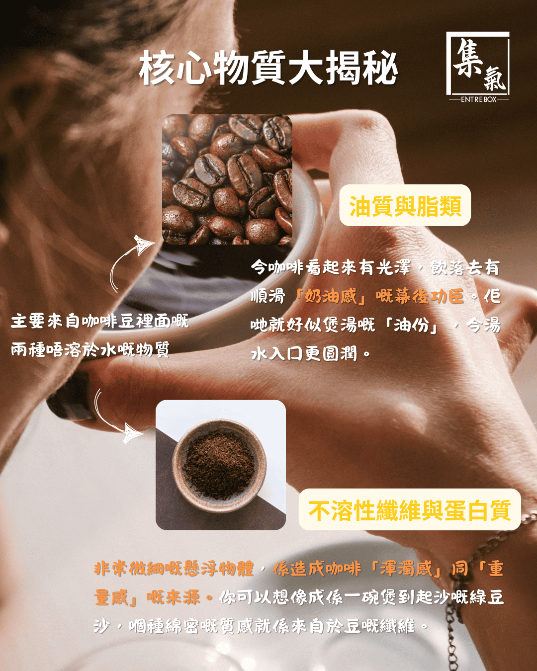 - 呢啲就係令咖啡看起來有光澤,飲落去有順滑「奶油感」嘅幕後功臣。佢哋就好似煲湯嘅「油份」,令湯水入口更圓潤。
